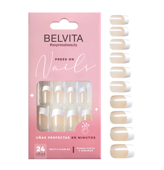 BELVITA te presenta sus Uñas PRESS-ON Classic French. Resultados Profesionales en casa y con los diseños que son tendencia. No necesitan pegamento ni tiempo de secado!